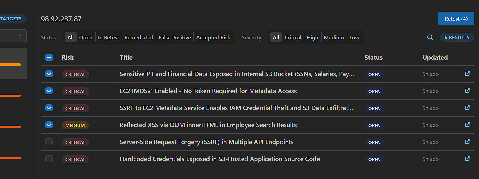 After a vulnerability has been remediated, select findings and use the Retest button to verify the fix. Sable re-runs the relevant checks against the target and updates the finding status based on the results.