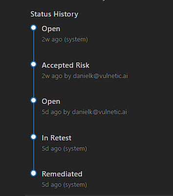 Each finding maintains a full status history timeline showing every state change, who made it, and when. Statuses include Open, Accepted Risk, In Retest, and Remediated, giving you a complete audit trail of how a vulnerability was handled from discovery to resolution.
