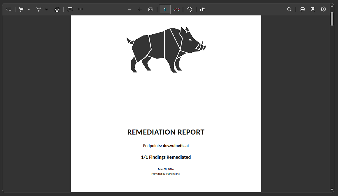 Generate a Remediation Report to provide documented proof that findings have been addressed. The report summarizes endpoints tested, the number of findings remediated, and the date of verification.